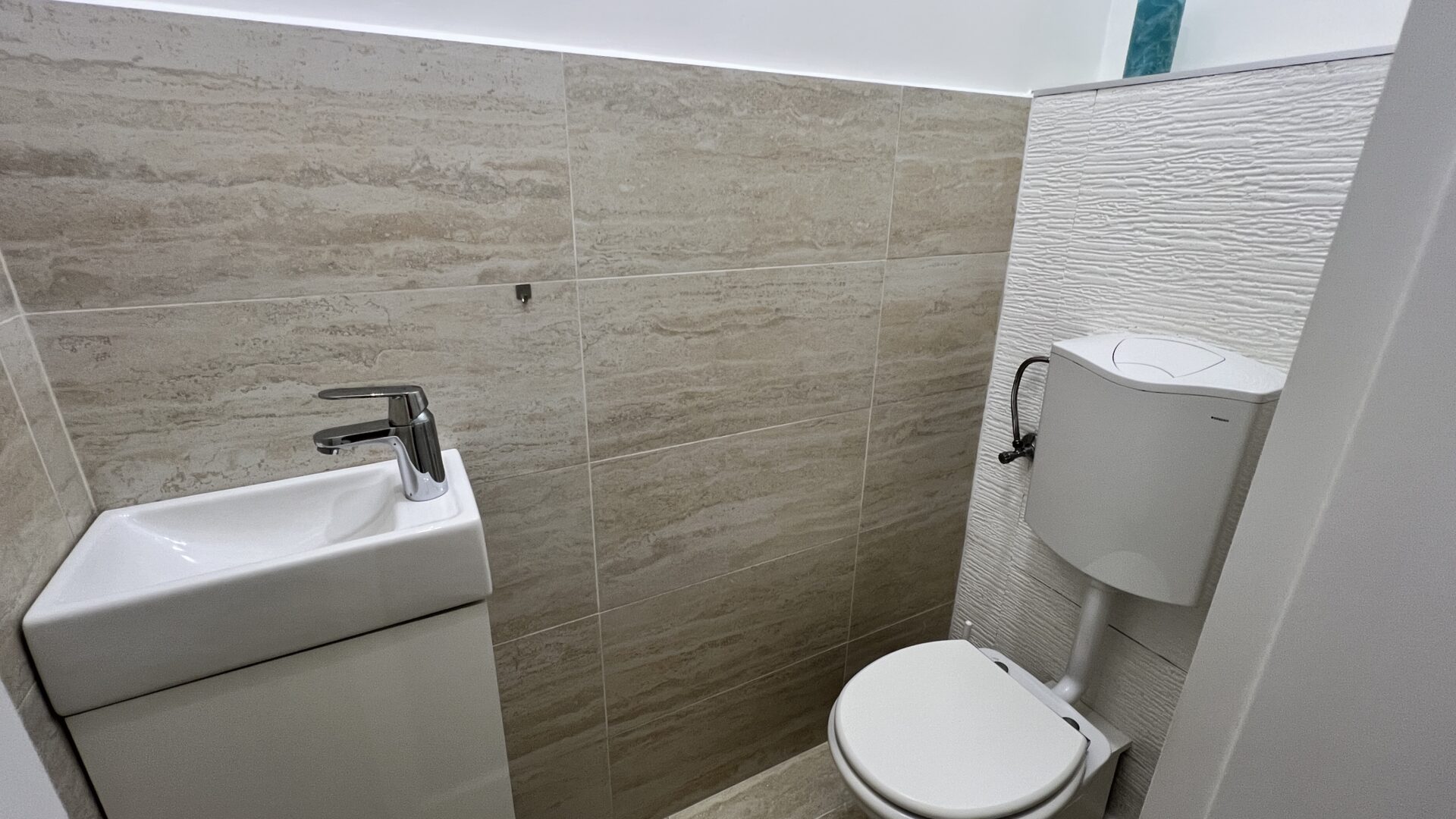 -WC külön helyiségben, kézmosóval, padlófűtéssel, légudvarra ablakkal